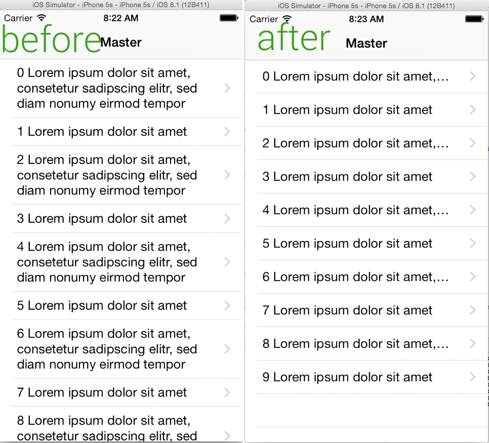 }更改确切的返回值显然没有任何效果。单元格总是具有适当的自调整大小。我不知道为什么提供估计高度会导致自动收费表开始,但它确实。iOS 8.1.2,Xcode 6.1。