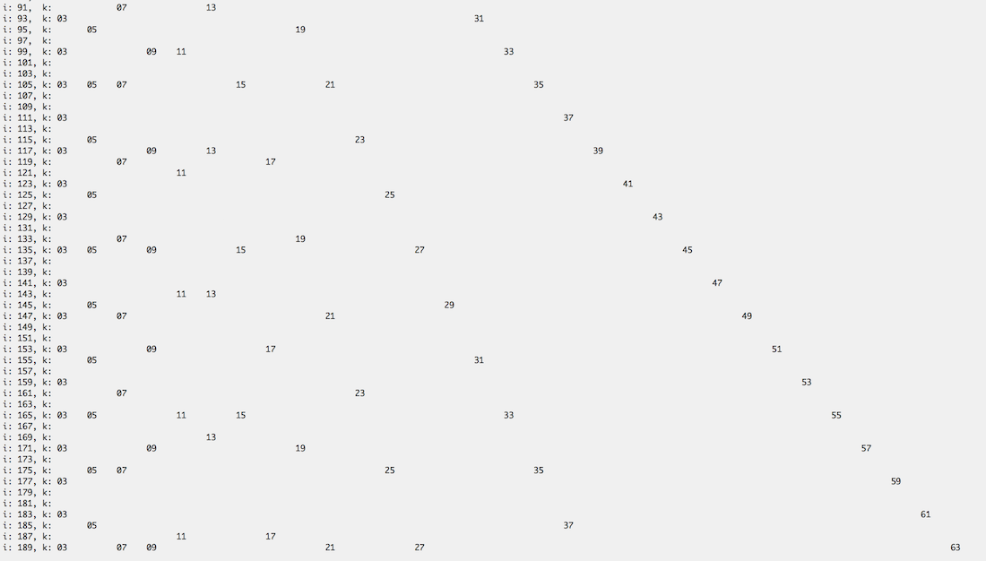 2.329469s (loop through outer loop odds only, cut two thirds)为什么要切一半?因为67/51不可能是整数。为什么要切第三?有很强的依赖性。查看分隔符以获得奇数: