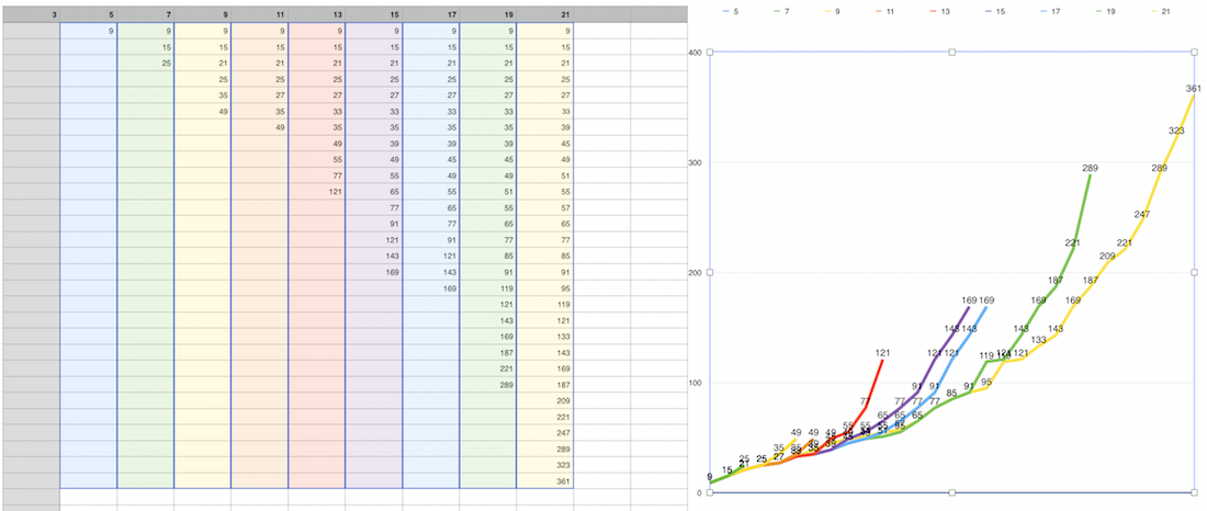 @denominators = [9, 15, 21, 25, 35, 49]循环通过111个元素有助于从1000个元素数组中找出素数。尽管@分母数组比实际分母大(见上面的电子表格),但它并不影响算法的正确性。我们拒绝@分母,并用步骤2循环到element/@loop_end,以避免偶数。