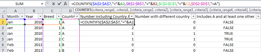 =COUNTIFS($A$2:$A$7,"="&A2,$B$2:$B$7,"="&B2,$C$2:$C$7,"="&C2,$D$2:$D$7,"=A")