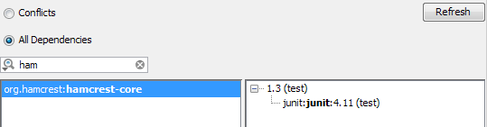 3)您提到的运行了一个依赖树,因此这似乎表明maven没有引入依赖关系。要重复检查这一点并绝对确定,我建议您使用Maven Helper插件。从插件设置对话框安装它并重新启动IDEA。重新启动后,转到您的pom文件。在底部,您现在将有一个‘依赖分析器’选项卡。选择它。然后在顶部选择“所有依赖项”。搜索logback。如果找到了,选择它,然后在右边你会看到一个反树,它是如何拉进来的。例如,对于hamcrest,我看到以下内容,告诉我junit正在拉它。