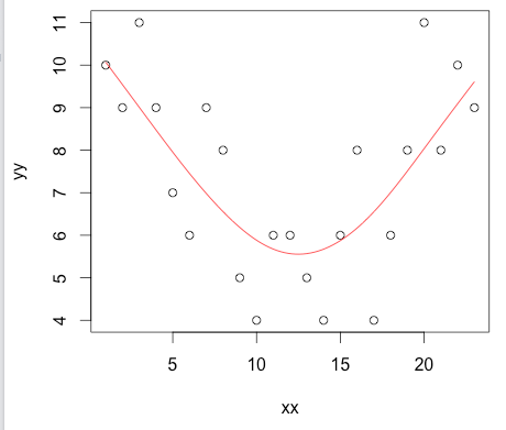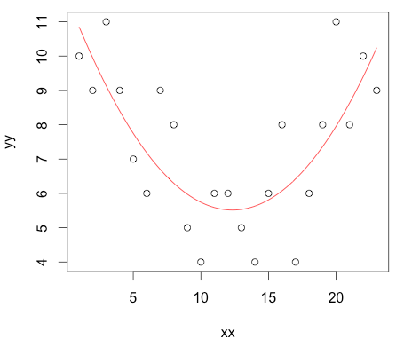 fit <- lm(yy ~ poly(xx, n=2, raw=TRUE), data=ddf)