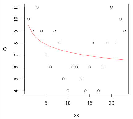 我有以下数据,其中xx和yy之间似乎存在曲线关系:
