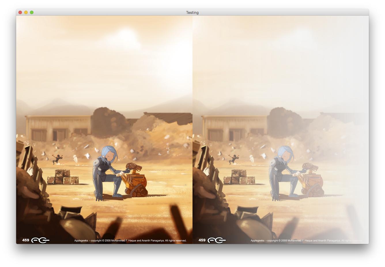 我正在制作一个游戏,希望有一个图像“淡出”从左到右,图像的左边部分有一个alpha值为1.0,右边有一个alpha值为0.0。(注意:我不想让它随着时间的推移而改变它的样子,就像渐入佳境,而只是从左到右逐渐消失,并保持不变)。试图画出我想要的最终结果如下: