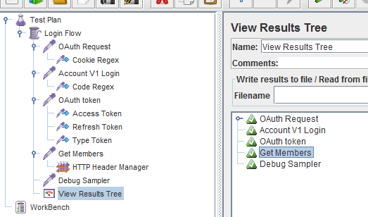 我想要做的是用rest和提供的文档复制一个应用场景,用户登录(请求oauth认证)并询问基本信息。我开始使用jmeter,并使该部分运行良好(日志记录和获取我所需的信息),如下所示: