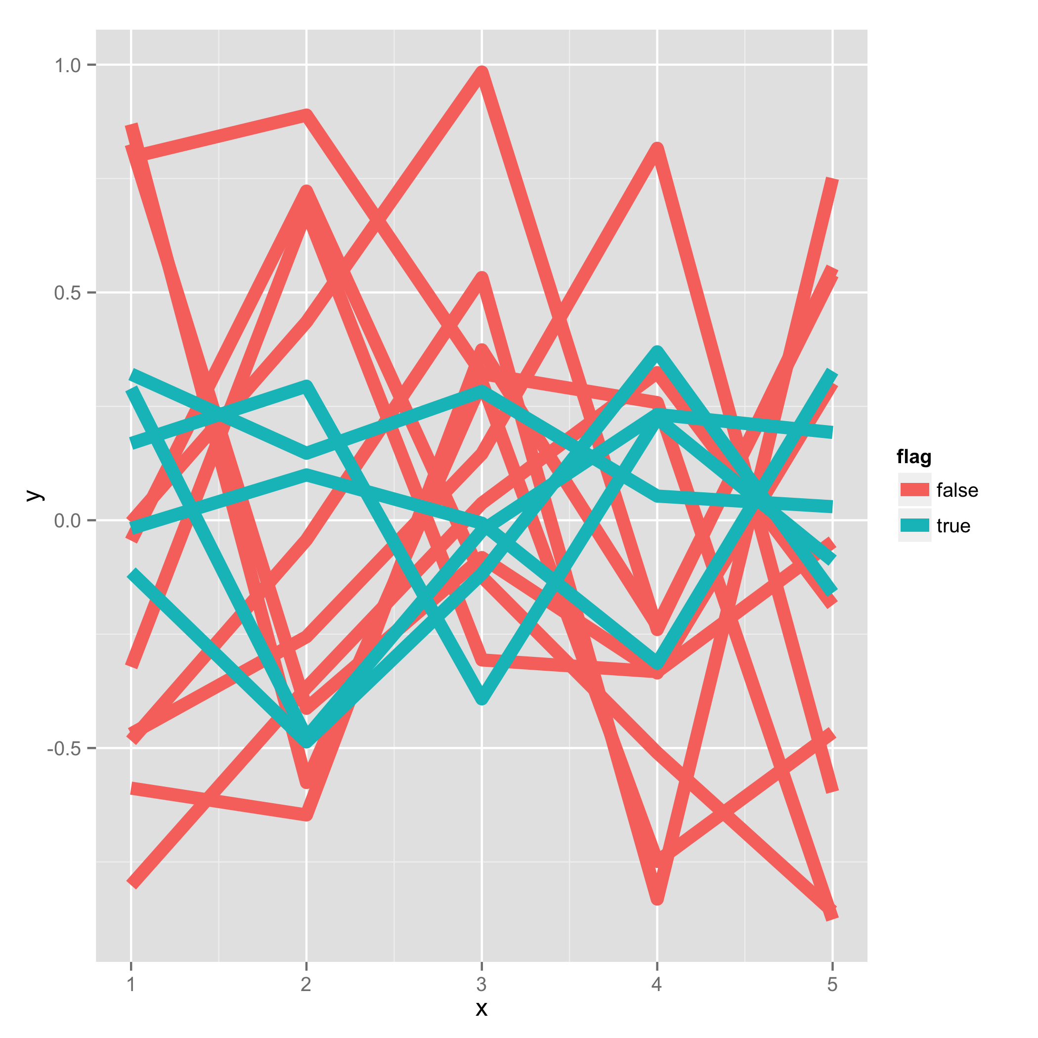 其中x和y是绘图的坐标,组是不同行的标识符,标志是表示线条组的一个特殊子集的布尔值。我想用ggplot来绘制这些线,这样带有flag = 'true'