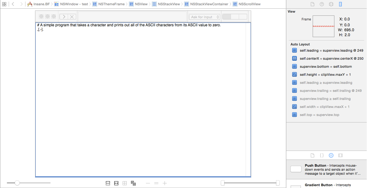 由于背景颜色,在这个示例中几乎不可能看到,但是滚动视图结束于窗口底部上方的几个像素。这里有一个来自视图层次结构检查器的更好的视图,我选择了这个2像素高的视图(单击此处查看更大的):