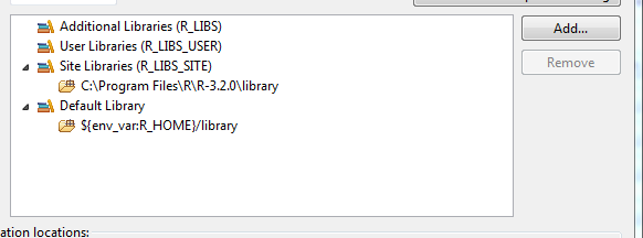 我已经安装了Eclipse露娜(64位)、Statet、Java 1.8.0_25 (64位)和R3.1.2(64位)。我正在windows 7(64位)上运行。根据需要,我使用以下方法安装了包"rj“和"rj.gd”: