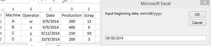 我有一个宏,它从几个日常日志表中提取信息,并在主工作簿中编译该信息。在同一个宏中,我操作数据,以便它填充几个图表。我的问题是,如果我能建立一个日期范围,我想看看,并只提取数据,信息将是最有用的。举个例子,如果我想看到从9/9/14到11/9/14所有机器产生的废品数量。有什么方法可以把这个添加到我已经创建的宏的开头吗?我正在处理的信息看起来有点像我下面的内容。