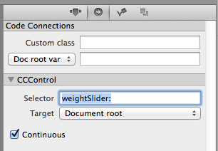 在SpriteBuilder中选择Slider,并在Connections选项卡上输入选择器的名称(由于您的实现接受一个参数-它还可以使用无参数的方法):