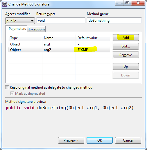 在生成的对话框中,使用 add *按钮向方法签名添加一个新参数。**默认值是将自动插入到已经调用该方法的所有代码中的内容,因此您可以选择合理的方法,或者将其设置为无效的东西(如单词FIXME),以强制在每个调用位置上进行编译错误。