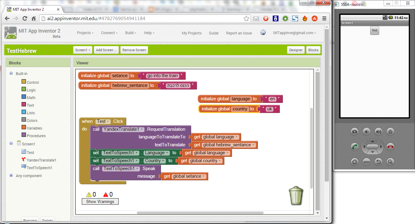 麻省理工学院的应用程序发明者支持65种语言,并将40种语言从文本传递到语音。问题不在应用程序inventor的编程中,但希伯来语不支持作为文本到语音语言,而且还在进一步开发中。我建议您使用Google来解决这些不便,因为它们支持180种语言,并且可以将105种语言进行文本到语音的交流。