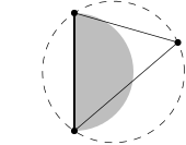 你只需要检查两个相邻的三角形。假设相邻三角形上的第三个顶点不在边缘的直径球内(也就是说,它表明边缘可能具有Gabriel性质)。空(由Delaunay属性)包围这个三角形(在下面虚空)包含一个半圆对应加布里埃尔球(在下面灰色)。如果你检查连接到边缘的两个Delaunay三角形,你知道加布里埃尔球的两个半部都是空的。