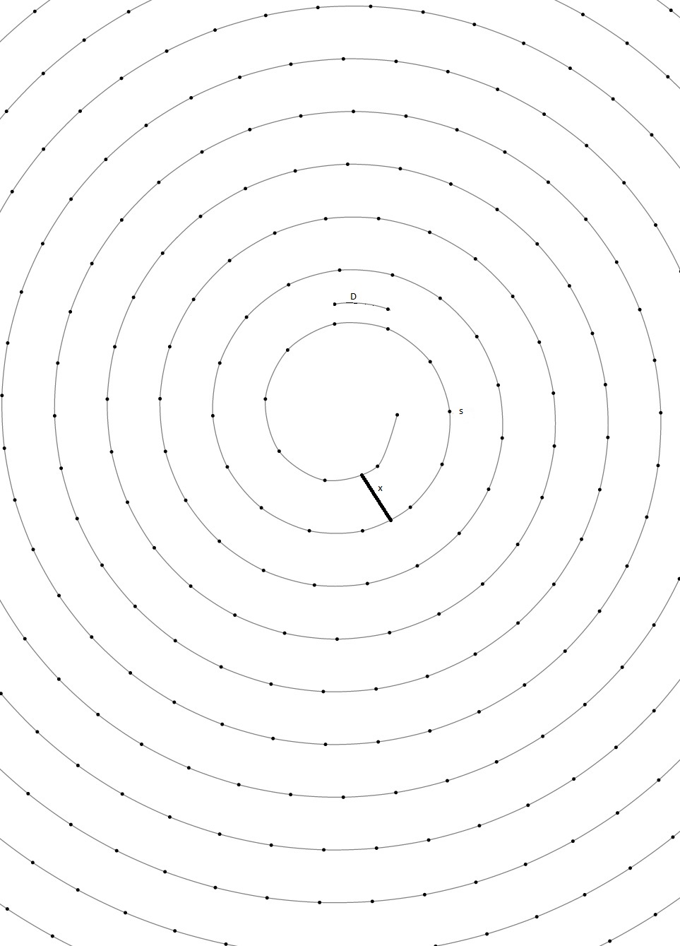 函数将遍历s*d的螺旋弧,并给出x和y笛卡儿坐标(图中的S点,s=10)。螺旋中心的第一点是0,0。