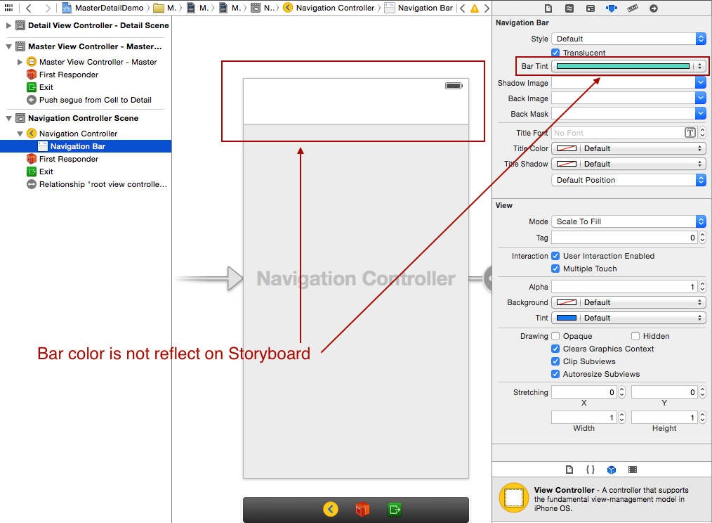 我使用的是适合ipad和iphone的viewController。现在,在那个viewController中,我为每个viewController插入了一个导航控制器。(令人惊讶的是,xcode允许您这样做。当时我不知道这是错的。)因此,我在导航控制器上设置了不是第一个的条形色调。(这是第二个视图导航控制器)因此,它有一个冲突的颜色,从第一个导航控制器,或当前导航控制器的颜色。