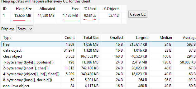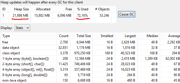 当您旋转图像时,底层软件可能会使用旋转矩阵为您完成此操作。这是一段时间内必须放入堆中的额外内存量。但是,如果堆中没有足够的连续空间,JVM将增加堆大小以适应额外的数据。当所有对该数据的引用丢失时,GC将悄悄地释放此内存,但堆大小将保持不变,以供以后使用。这是因为使用操作系统已经分配的内存通常更快,然后释放内存页并每隔一段时间从OS请求新的内存。实际上,Java有指示何时减少堆大小的启发式方法,例如,在一段时间之后,当大部分堆不被使用时。