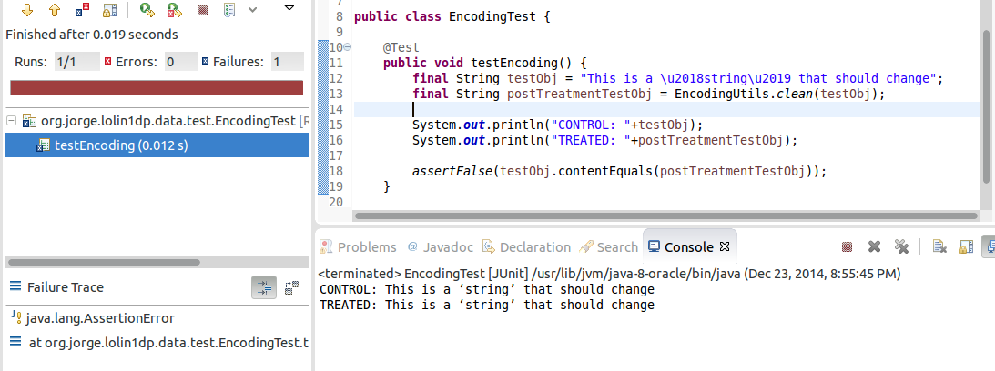 Java已经取消了以字符串形式出现的转义代码,因此您的testObj包含Unicode字符0x2018和0x2019,而不是文字字符串"\u2018“和"\u2019”。因此,StringEscapeUtils.unescapeJava(...)返回相同的字符串。这意味着testObj.contentEqual(postTreatmentTestObj)为真,因此assertFalse(...)测试失败。