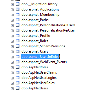 它还创建其他表(包括--但不限于)-- AspNetRoles --存储角色-- AspNetUserRoles --将用户存储在角色中。