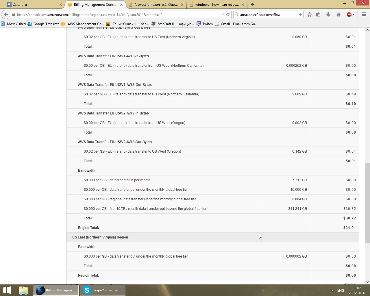 我在亚马逊ec2上有一个linux和windows实例,时间大约为7-8个月。每个月我的账单都是0.01美元-0.06美元。但两周前我收到了一份虐待报告。我看了看我的账单,大约20美元!98%是DataTransfer。我终止了我的工作,改变了弹性的ip入口。今天看来一切都很好,我的账单是31.95!在图片上,你可以看到巨大的月份数据传输超出全球免费层。大约3.5 TB。