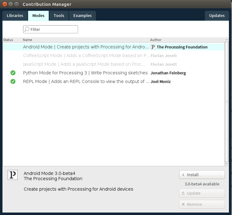 我试图在处理IDE上安装Android模式,但是我似乎在IDE上找不到它,我从互联网上下载的每个人都是为了windows版本。我在研究修邦图。