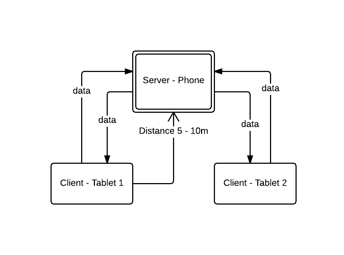 说了这些之后,我不知道服务器在您的应用程序中的角色是什么。如果这个项目和你画的一样,我只会用这两块平板电脑,除掉中间的那个人(电话)。除非,背后还有其他原因。
