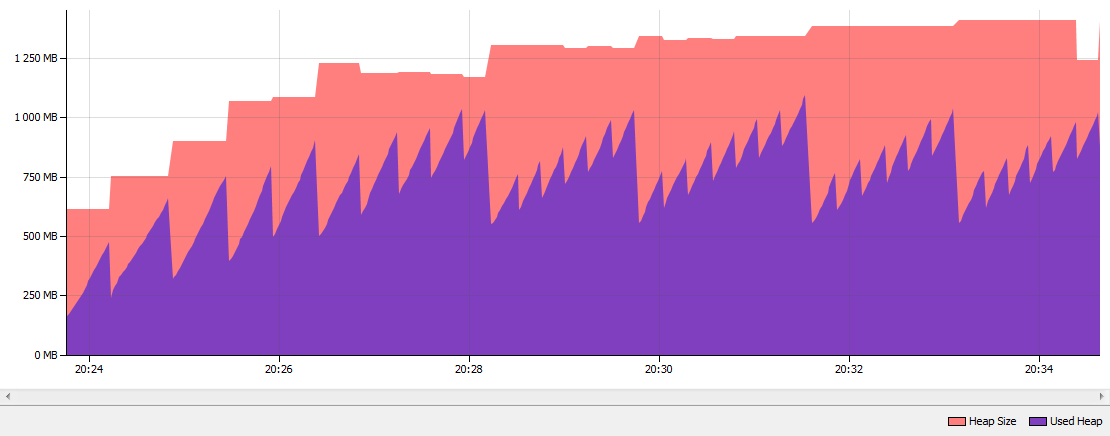 [Dropped: 0]这是运行应用程序10分钟后的结果。如您所见,字符串重复执行了452次和801.6 MB字符串。字符串重复检查27000 000字符串。当我将Java 7中的内存消耗与标准的并行GC和Java8u20与G1 GC和启用的字符串重复进行比较时,堆丢弃了大约50%的: