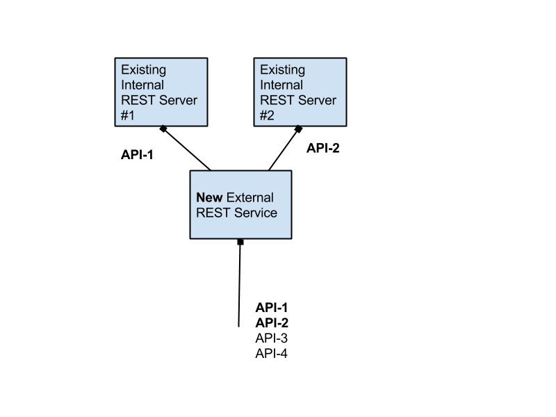 我有许多现有的REST服务(下面是#1和#2 ),它们运行在仅在内部使用的不同端点上。现在,我想使用Spray向外部公开一些REST (API-1和API-2),因为这个外部端点还将提供一些额外的API (API-3,API-4)。