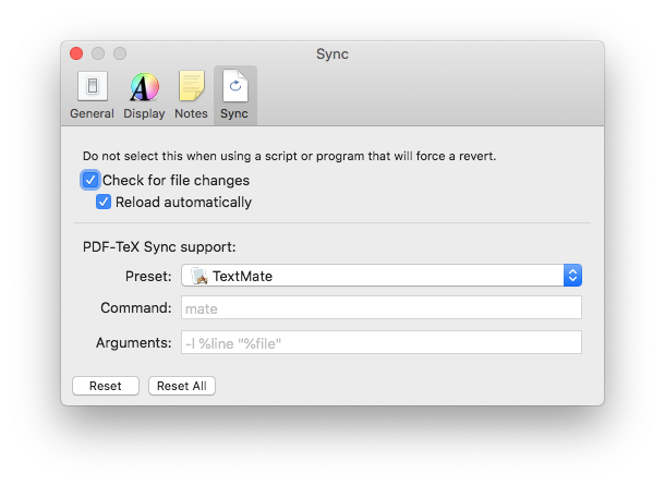 然后选中"Reload自动“框。重新启动Skim,文件一生成就会自动更新。