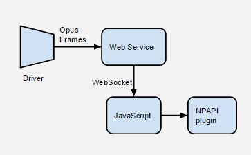 我们需要用一个没有插件的解决方案来取代我们的NPAPI浏览器插件。我们有第三方输入设备,为我们提供实时音频形式的Opus‘帧’。我们使用二进制WebSockets将这些帧传输到浏览器,然后将数据转发到我们的NPAPI插件进行解码和音频播放。见图。