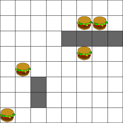 假设有一个网格,包含两个墙(被阻塞的单元)以及放置在网格上任何位置的食物。