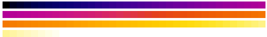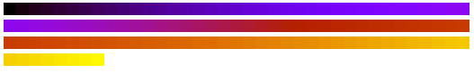 对于那些使用GNUPLOT的人来说,这个调色板看上去可能很熟悉,因为默认的PM3D调色板运行的是黑色、蓝色、洋红-橙色-黄色。
