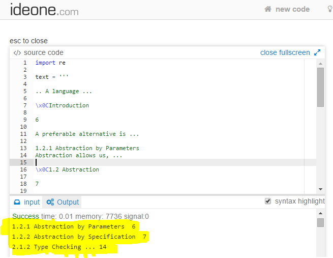 print '{}\t{}'.format(item.group(1), page_no)这产生了54个三级标题。不幸的是,它对你的文本是独一无二的。在我花了很长时间才弄明白这一点的时候,我可以用一个好的文本编辑器半手动地提取信息,这个编辑器可以进行正则表达式搜索(这就是我为找出并验证它所做的)。