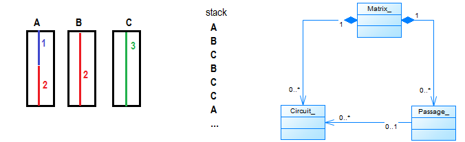 我有一个中央类,矩阵,它有几个电路通过它,类电路。这个矩阵是一堆通道(类通道),其中循环一个或多个电路。一个电路也可以通过几个通道。