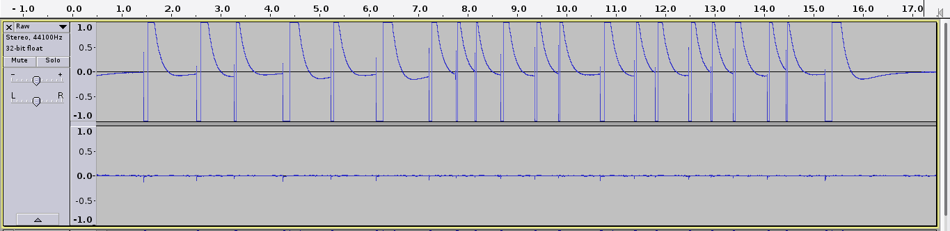 从速度传感器出来的电线以3.5毫米千斤顶结束。我把它插到笔记本电脑的麦克风端口上,录下了我在高速和低速行走时的“声音”。我已经附上了图像的波形记录在奥迪分别为低速和高速。