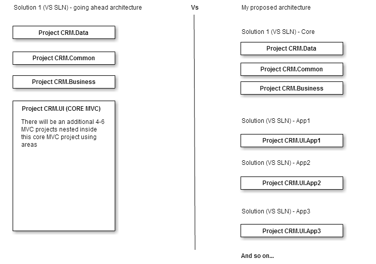 因此,提议的所有项目都位于一个SLN下,即数据、公共、业务和用户界面。显然,在一个小型应用程序中,这将是很棒的,但考虑到这将是一个包含4-6UI应用程序(所有web应用程序)的大型软件。