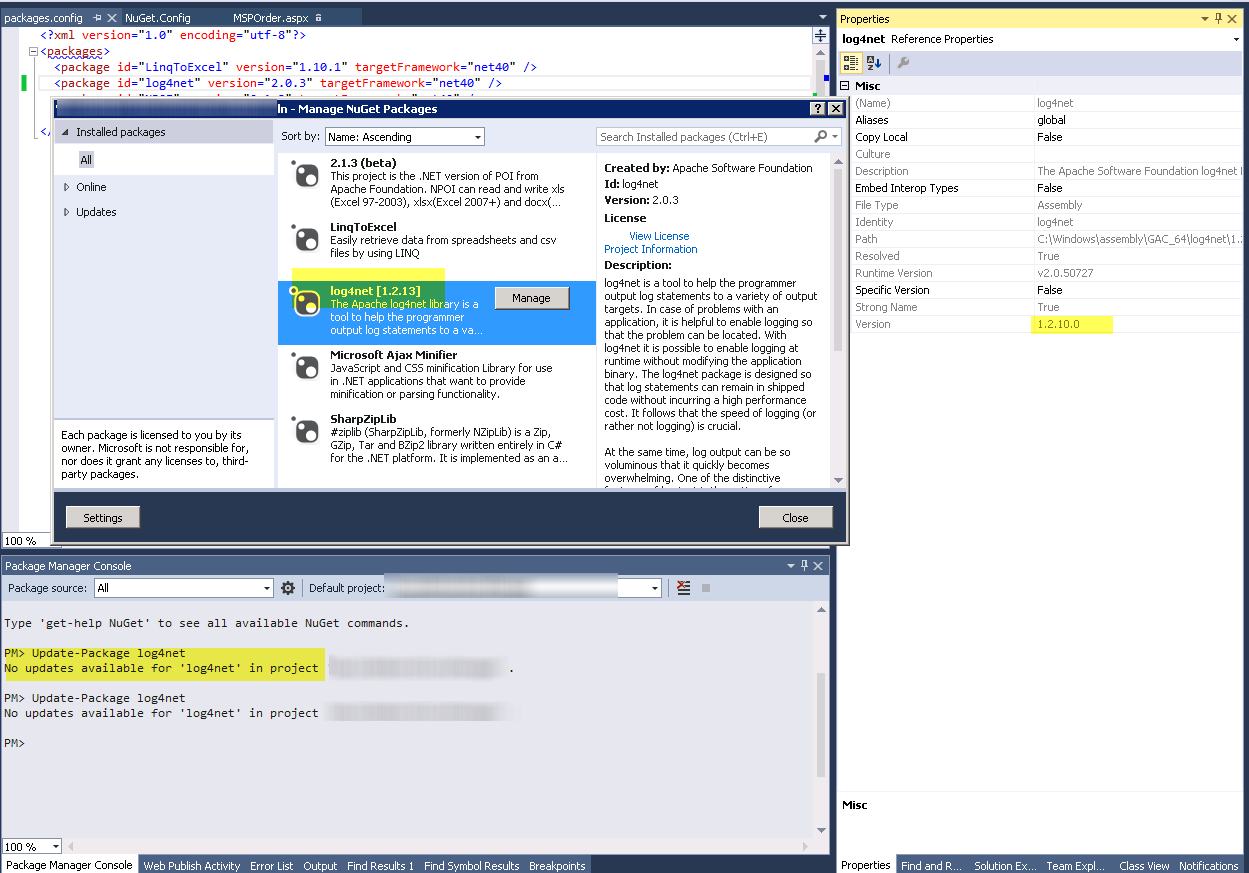 查看Properties窗口中的路径,它似乎在GAC中找到了log4net,而不是从NuGet包中找到的。我会把log4net从GAC中移除。然后Visual应该从包目录中使用log4net。