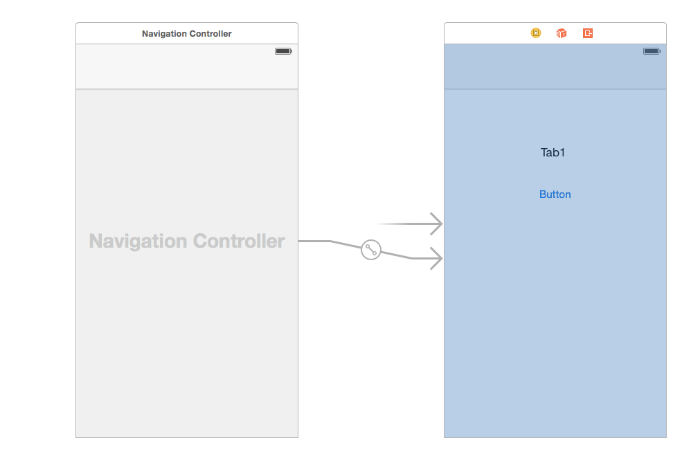 您的问题是由于试图将故事板控制器和应用程序委托中的代码混合。您正在实例化tab1VC,并使第一个选项卡中的控制器“不知道”您在故事板中添加的导航控制器的任何内容。如果您想用代码(我不推荐)来执行它,则需要实例化导航控制器(它将负责实例化其根视图控制器),并将其添加为viewControllers数组中的第一项。