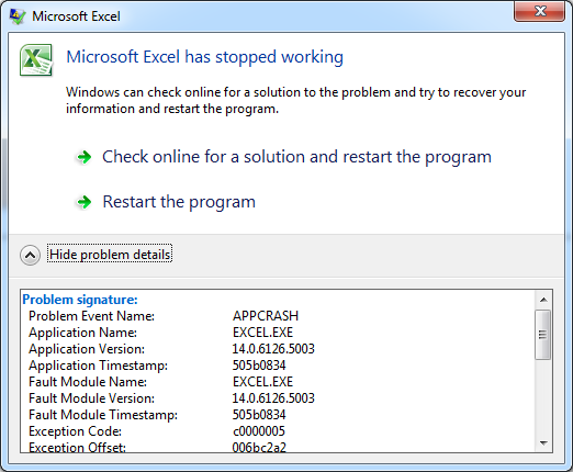 如果您有一个易失性函数(您的代码函数包含"Application.Volatile (True)“标记),其中您更改了DisplayAlerts状态(例如,"Application.DisplayAlerts = False"),那么如果您在包含这两个命令的工作簿中更改工作表的名称,Excel (直到2010年,还没有经过2013年的测试)将崩溃。
