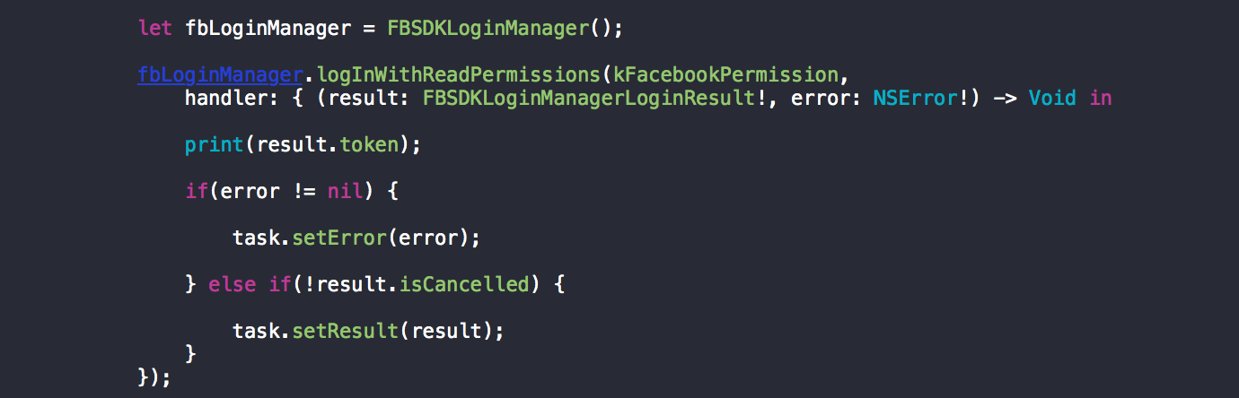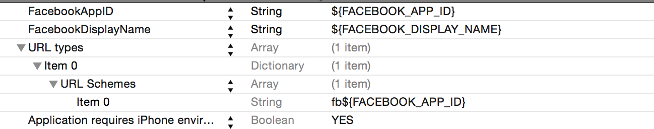 我目前正在尝试使用4.0版本的SDK实现Facebook登录,3.+版本也会出现这种情况。当我调用logInWithReadPermissions (4.0版本)或openActiveSessionWithReadPermissions (3.+版本)时。在用户可以选择之前,立即使用isCancelled (4.0版本)和3.+ (3.+版本)调用闭包/块(取消或确定)。我想这可能是在我的plist设置的URL方案的一个问题,但我已经检查了一遍又一遍,一切似乎都是正确的。只是想知道是否有人对解决这个问题有任何想法。我的捆绑ID是正确的,单信号是打开的,本机应用程序是启用的,在Facebook开发控制台。参见下面的一些示例代码和配置(4.0版本)。