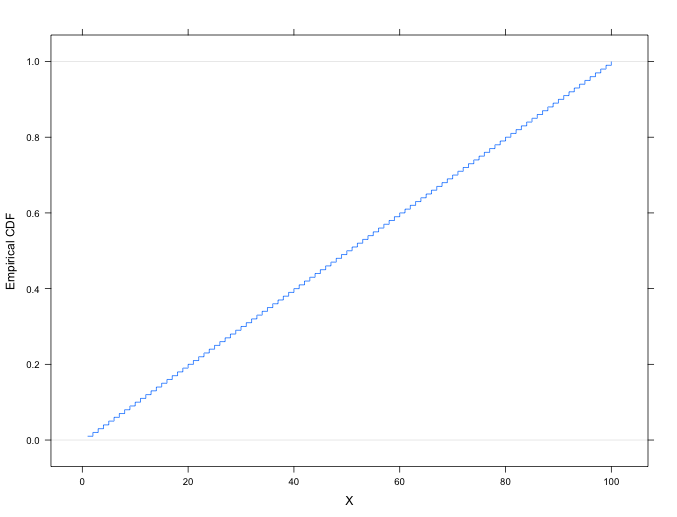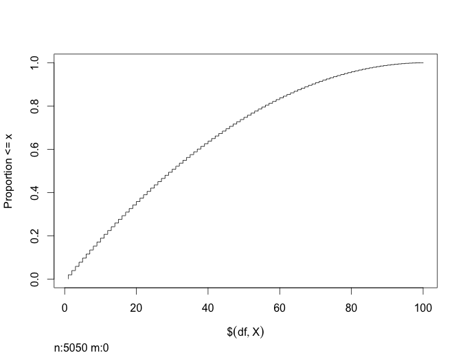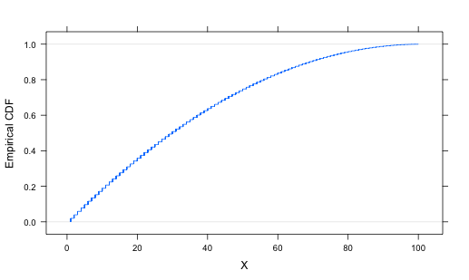 ecdfplot(~ rep(x= X, times= W), data=df, xlab= "X")