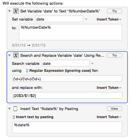 我有一个键盘宏工具(键盘大师),它在%NumberDate%变量中返回当前日期;它包含2015年3月31日的字符串"3/ 31 /15“。