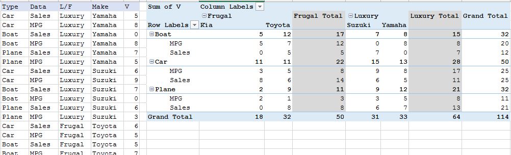正如人们所建议的那样,在源数据中添加奢侈/节俭作为列,可以达到您所需的目的。但是,这将需要进行大量的重新排列,使源数据占用更大的范围,并且不能提供理想的结果,因为只添加一个列,同时允许在PivotTable中按列进行筛选,每个筛选器视图仍将显示所有列(尽管大部分为空白)。