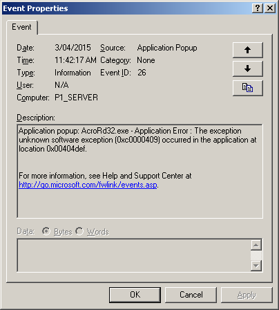 MB_ICONSTOP | MB_SERVICE_NOTIFICATION);我已经排除了Adobe作为服务运行的可能性。它是11.0.08版。当选择PDF文件的Windows窗口成为活动窗口时,崩溃似乎是偶然发生的。