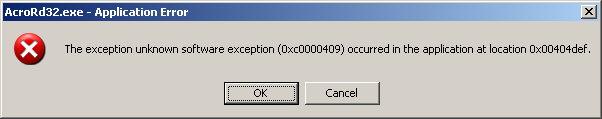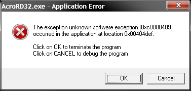 "The exception unknown software exception (0xc0000409) occurred in the application at location 0x00404def.",