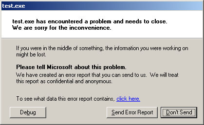在Windows上,大多数未处理的“结构性例外” (例如访问冲突)会产生一个对话框(它后来被重新命名为“dwwin.exe错误报告”,但可执行文件是dwwin.exe和I will http://blogs.msdn.com/b/oldnewthing/archive/2005/08/10/449866.aspx):
