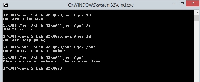 int age = Integer.parseInt(args[0]); //taking in an integer input throws NumberFormat Exception if not an integer
