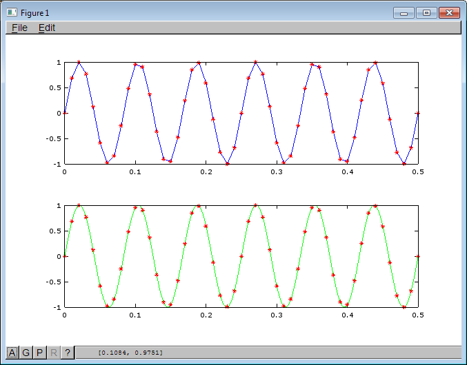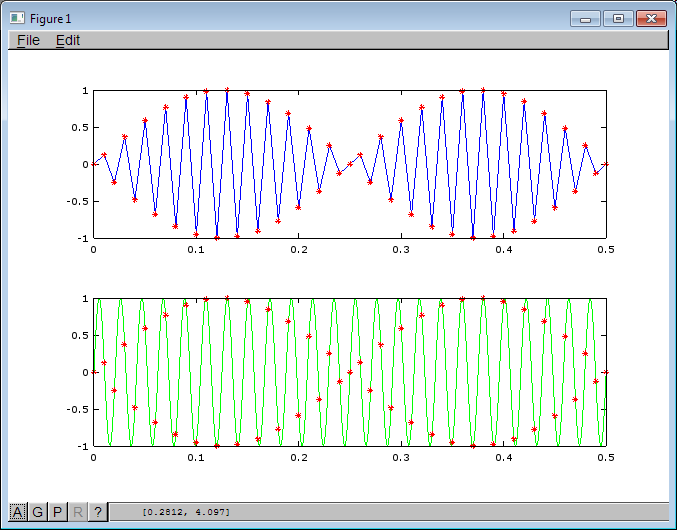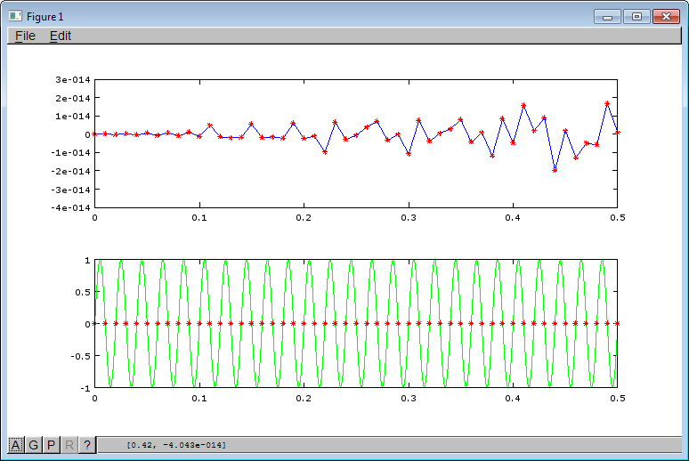 具体原因是什么?这是奈奎斯特采样定理,因此它应该适当地产生正弦。当然,当我取,f,时,我得到了更好的结果和很好的正弦形状。我对自己的解释是,Matlab在使用浮点数时遇到了困难,但我不太确定这是否属实。有人有什么建议吗?