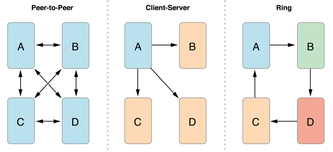尽管GKMatch对象在所有参与者之间创建了完全的对等连接,但可以通过在其之上分层环形或客户端服务器网络体系结构来减少网络流量。图8-1显示了四人游戏的三种可能的网络拓扑.在左边,点对点游戏在不同的设备之间有12个连接.但是,您可以通过指定其中一个设备作为主机,在此基础上对客户端服务器架构进行分层。如果您的游戏只发送到或从主机,您可以将连接的数量减半。环形结构允许设备仅将网络分组转发到下一个设备,但进一步减少了连接的数量。每个拓扑提供不同的性能特征,所以您需要测试不同的模型,以找到一个提供您的游戏所需的性能。