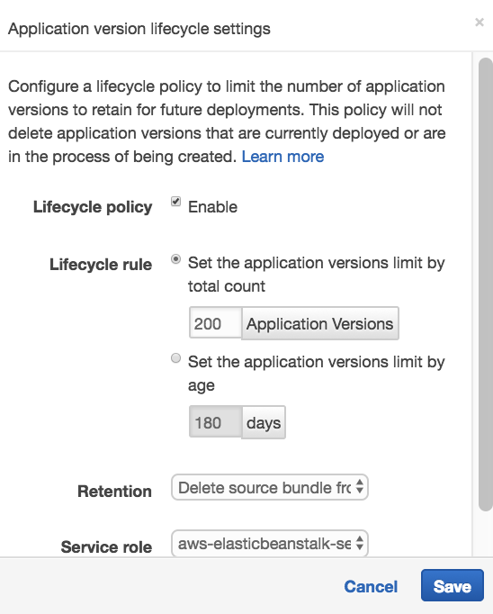 每次创建新的应用程序版本时,弹性Bean秸秆都会应用应用程序的生命周期策略,并且每次应用生命周期策略时都会删除多达100个版本。弹性Bean秸秆在创建新版本后删除旧版本,并且不将新版本计算到策略中定义的最大版本数。 弹性Bean秸秆不删除当前由环境使用的应用程序版本,也不删除部署到策略触发不到10周前终止的环境的应用程序版本。 应用程序版本限制适用于区域中的所有应用程序。如果您有几个应用程序,请使用适当的生命周期策略配置每个应用程序,以避免达到限制。弹性Bean秸秆只在应用程序版本创建成功时应用策略,因此如果您已经达到了限制,则必须在创建新版本之前手动删除某些版本。