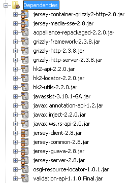 如果讨厌找到我需要的依赖项,就像jars依赖于依赖于其他jars的其他jars一样。即使我必须在不使用Maven的项目上工作,我仍然会创建一个新项目,添加核心依赖项,并查看它们会产生什么效果。从那里我就可以从回购处拿回来了。例如,一个带有Grizzly-泽西-JerseySSE的项目。